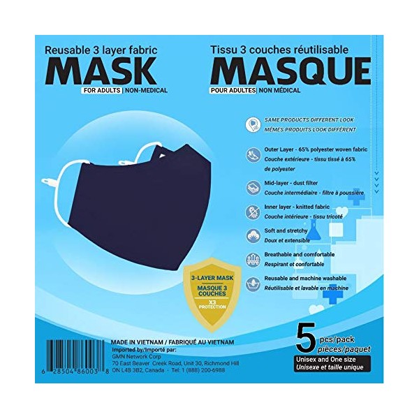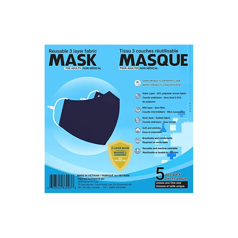 - Sequence Reusable 3 Layer Fabric Mask for Adults - 5 Pack (Blue)