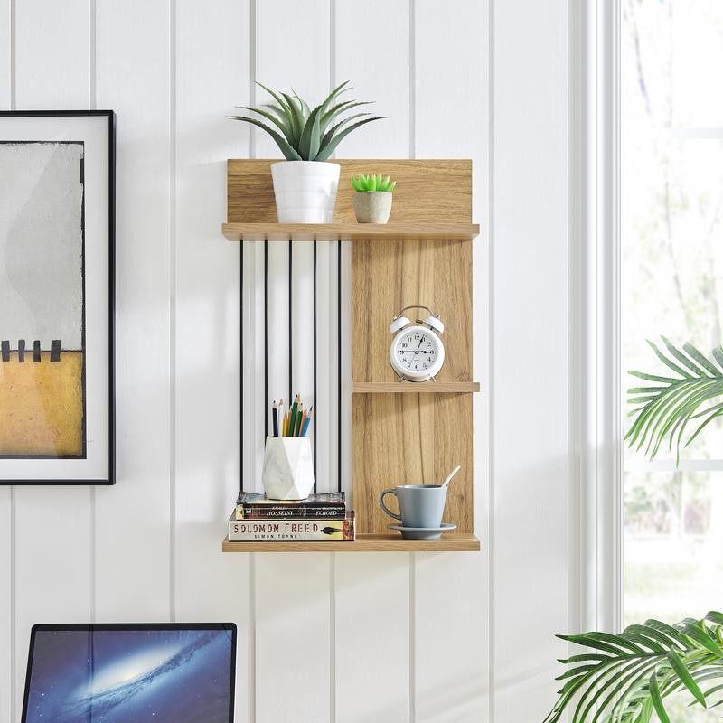 The Danya B. Seville Dynamic Utility Ledge Shelf offers a contemporary design invoking mid-century modern forms. Your favorite decor is ready to be showcased in style on the three tiers of floating platform shelves, connected by a trellis-like rod design in contrasting black accents. This unique design allows for taller items such as houseplants or reed diffusers to be placed on the left side of the shelving unit, while smaller trinkets and decor can be placed on the right side and smaller middle shelf. The platform ledges are also perfect for displaying books, photos, or art. The modern, minimalist design offers a bold shelving solution for any room, from living room to bathroom. Featuring a lightweight and easy-to-assemble design, this shelf is easy to mount to the wall of any room or hallway. This utility wall shelf unit is available in a Chestnut & Black, White & Black, and White & Gold finish to best match your preferred style and decor.