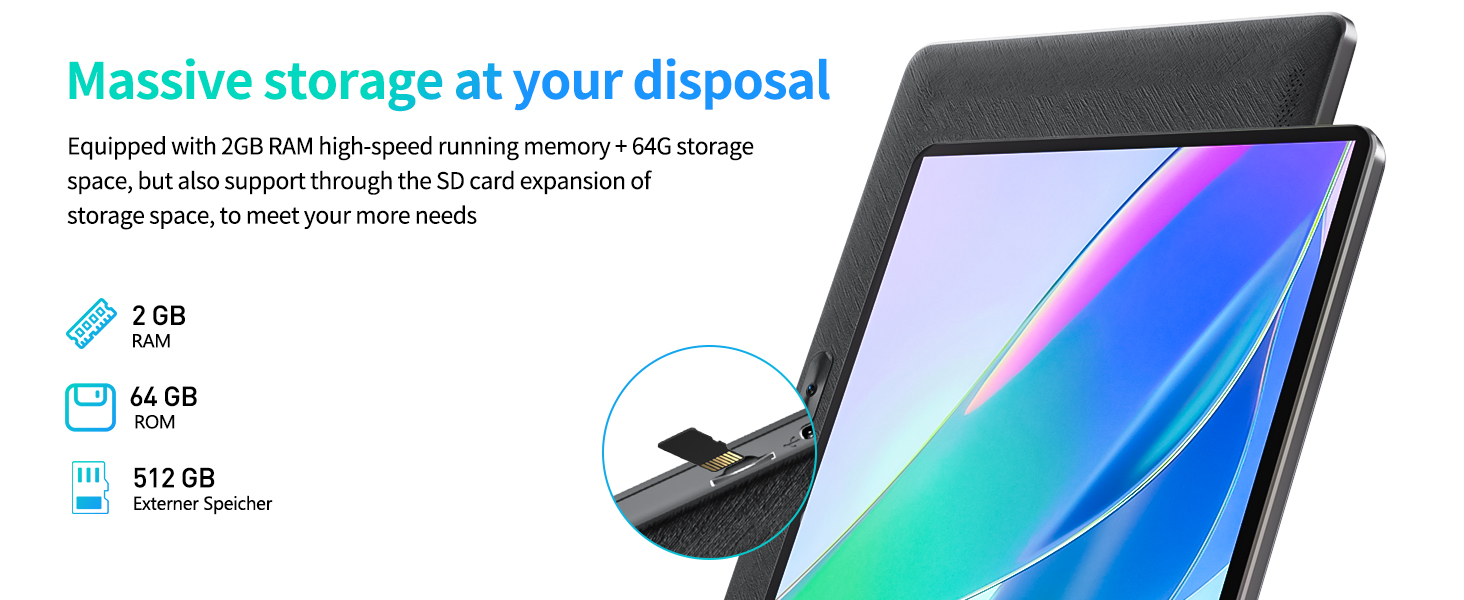 This 10.1-inch kids tablet features 2GB RAM + 64GB ROM, with expandable storage up to 512GB via MicroSD, giving your child plenty of space to download games, music, videos, and educational apps. Launch apps faster and enjoy smoother multitasking without worrying about running out of space.