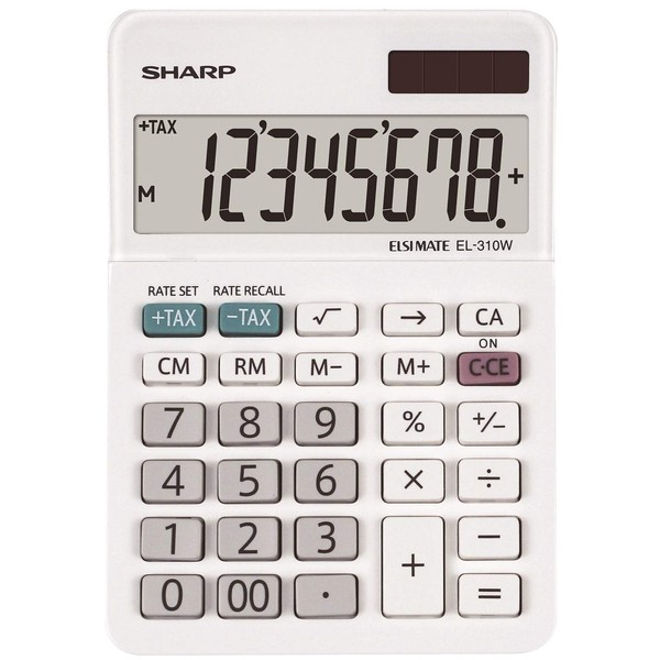 - The desk calculator with angled display has a white modern surface and a large 8-digit display