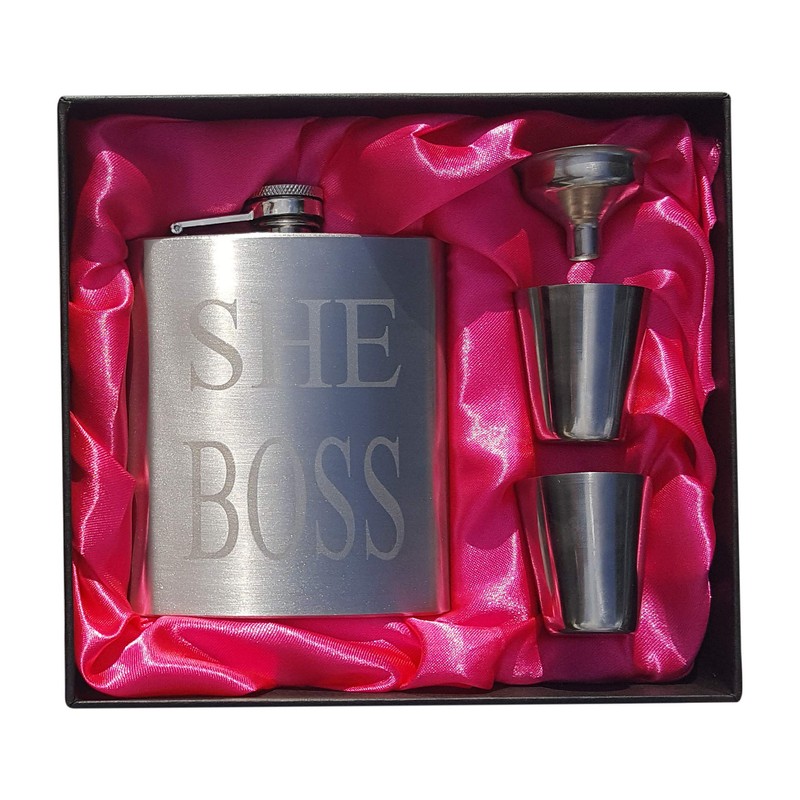 Give as a Gift This is a perfect flasks to give as a gift. This can be the perfect set for ladies night, gift for a gal pal, bachelorette parties (and other fun get togethers with the ladies). What's Included This set includes a rectangular flask engraved with the words SHE BOSS. The flask is made of stainless steel, two shot glasses, and a convenient funnel. All of this is delivered in an elegantly packaged gift box. Keep 7 oz of your favorite drink with you in an impressive flask. This set contains two shot glasses so you can enjoy a drink with a friend. Who likes to spill liquor? This set conveniently comes with a funnel makes so you don't miss a drop when pouring into the flask. Quality The set is made of 304 grade stainless steel which is specially formulated with 18% chromium and 8% nickel to resist rusting. This is the same grade of stainless steel used in kitchens and restaurants because of its ability to avoid rust and corrosion.