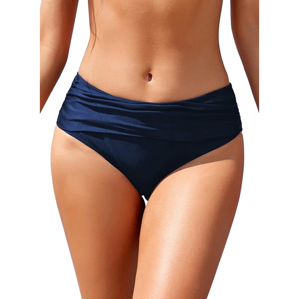SHEKINI Womens Ruched Bikini Bottom Solid Medium Waisted Tummy Control Blue