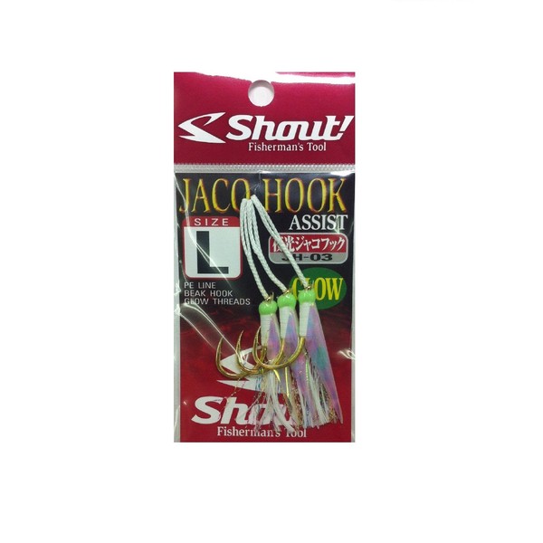 Shout! Jaco Hook size M, M-Glow, L, L-Glow, LL & LL-Glow JH02 - PE Line, Break Hook, Rainbow Threads JH03 - Glow assist hook, with luminous aurora sheet, glow thread and head. An assist hook that adds the appeal of mackerel skin and rainbow threads to a fine wire hook exclusively for the coastal waters that emphasizes hooking performance. It is possible to attract and eat targets that did not react with the jig alone until now. In addition to its visual appeal, the lightweight hook and material make it easier to suck into the target's mouth, improving the hooking rate compared to normal assist hooks. A new lineup of 3S and SS sizes compatible with casting jigs.