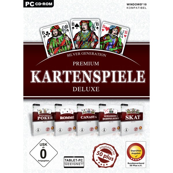 The current collection of all original Silver Generation card games with the latest updates - all in one pack. The collection contains realistic simulations of the card games Skat, Sheephead, Double Head, Poker, Canasta and Rummy, which offer fun for all generations, right up to old age thanks to their successful and intuitive 3D design. Computer opponents can be selected in the game strength offer the right challenge for everyone. Included are single player, network and Internet mode. The game environment, rules, map image and sounds can be individually adjusted. For beginners, there is a moderated game entry and detailed game instructions (English language not guaranteed).