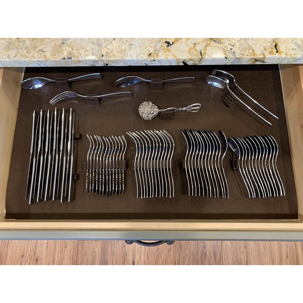 Create a luxurious placeholder for your silverware using this unique drawer lining kit. The soft felt liner is 17.75" wide by 39.5" long and can be cut into smaller sections and placed on the bottom of your drawer. Silverware holders adhere on top of the felt liner to neatly and securely hold silverware in place.