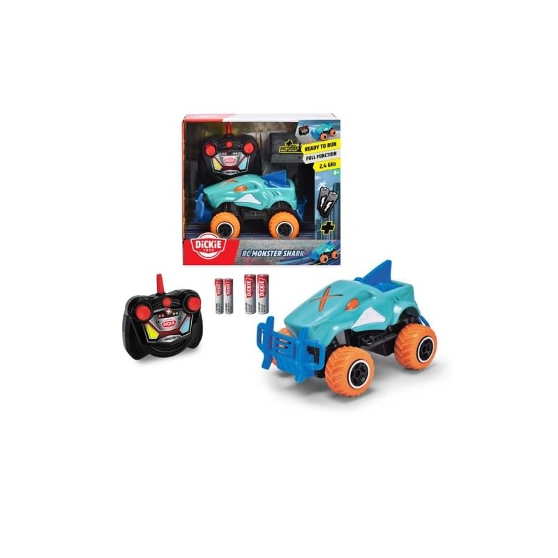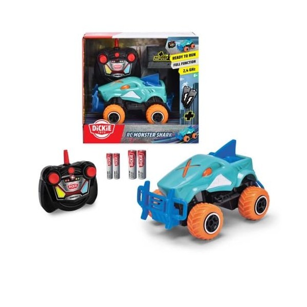 • Monstertruck-Reifen - Ausgestattet mit vier dicken Rädern und einem breiten Rammschutz, kann das Spielzeugauto in Hai-Optik inkl. charakteristischer Flosse mühelos gesteuert werden - bis max. 8 km/h.