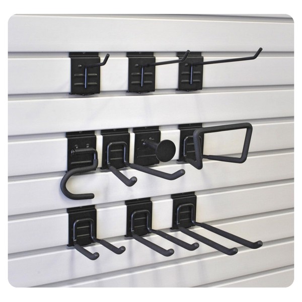 - Slatwall Variety Hook Kit features 10 spring-loaded locking hooks for storing and organizing items in your garage on slatwall panels.
