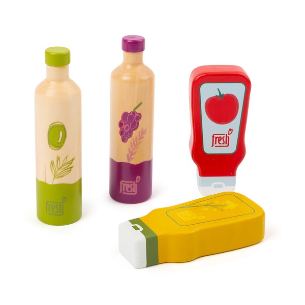 - A beautiful sauce set with 1 olive oil bottle, 1 vinegar bottle, 1 ketchup bottle, 1 mustard bottle as an addition to the children's kitchen or the grocery shop