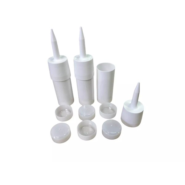 Made from white HDPE (high density polyethylene) plastic. The nozzle is 3 inches long and can be trimmed as desired. The body of tube is 5 inches long. 9 pieces set, 3 tubes, 3 TubeANew tops, and 3 plungers. Fits standard size caulk gun, also known as 10oz size caulk gun. You can control the caulk bead size by cutting the desired length of the plastic tip. To use, install the plunger, fill with product from top, install the TubeANew top, trim the tip, install in your caulk gun , and dispense your product. (**Some caulking guns come with a tip cutter**). No food safety testing has been performed on this product.