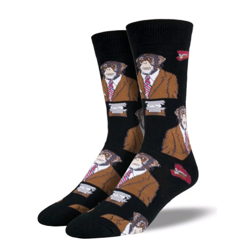 • Black socks featuring a graphic print of chimps in suits and office supplies.