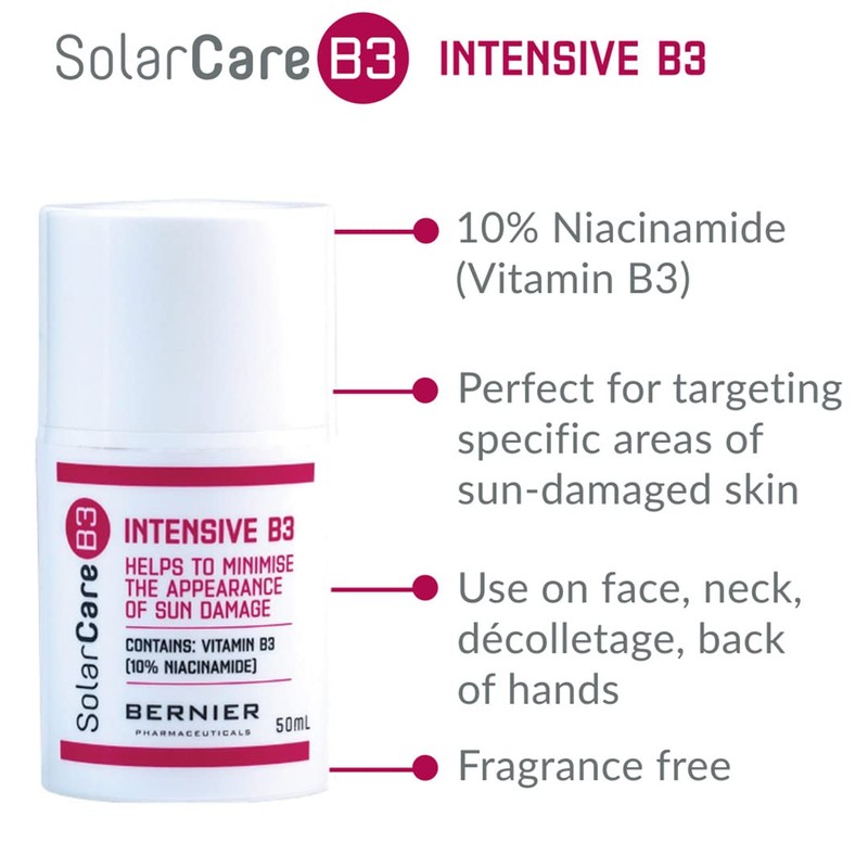 - SolarCareB3 Intensive B3 is a concentrated moisturiser to target specific areas of sun damaged skin. With twice the regular concentration of Vitamin B3 (10% Niacinamide) this light weight, intensive B3 moisturiser is easy to use. Apply topically to concentrated areas. Perfect for everyday use, including under makeup.