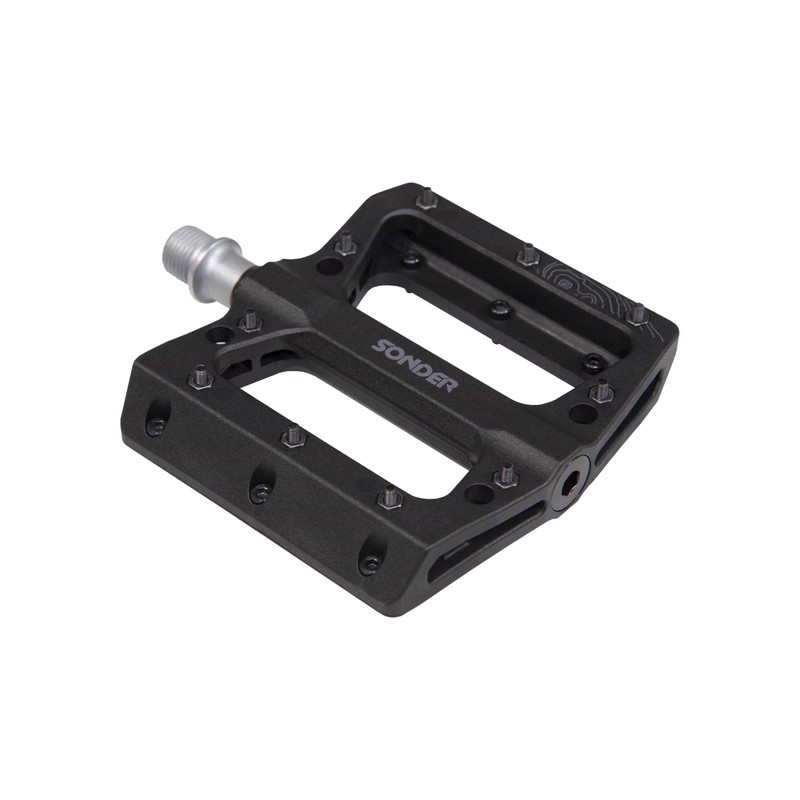 • Performance thermoplastic flat pedal with steel grip pins and a Chromoly axle, designed for use and abuse on the trails.