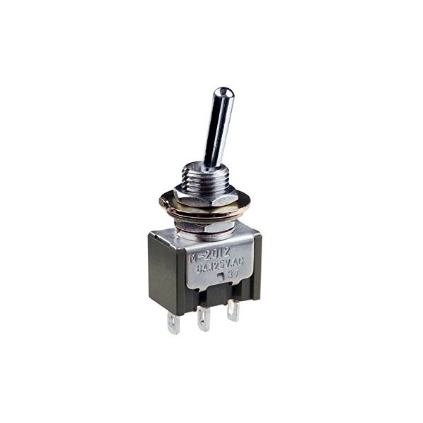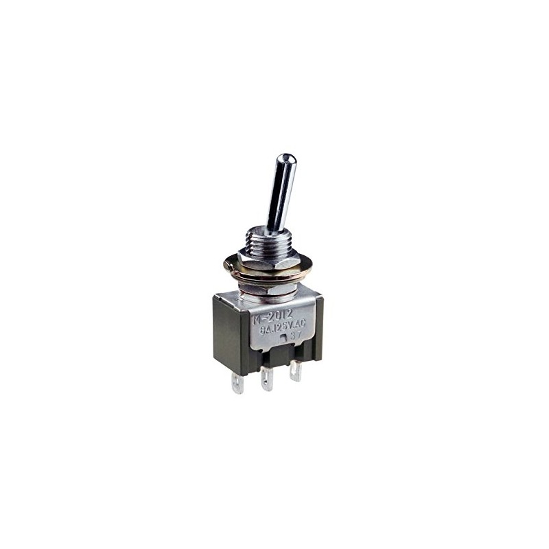 3A 125V Rated. Single Pole Double Throw Contact Arrangement. Toggle latches in each of the two positions. Toggle/lever length 11mm. Requires 6mm panel mounting hole. Nuts, anti-rotation washer & shakeproof washer supplied. 3 solder terminals for connection to wiring. Dimensions: 12.7 x 11.43 x 21.72mm