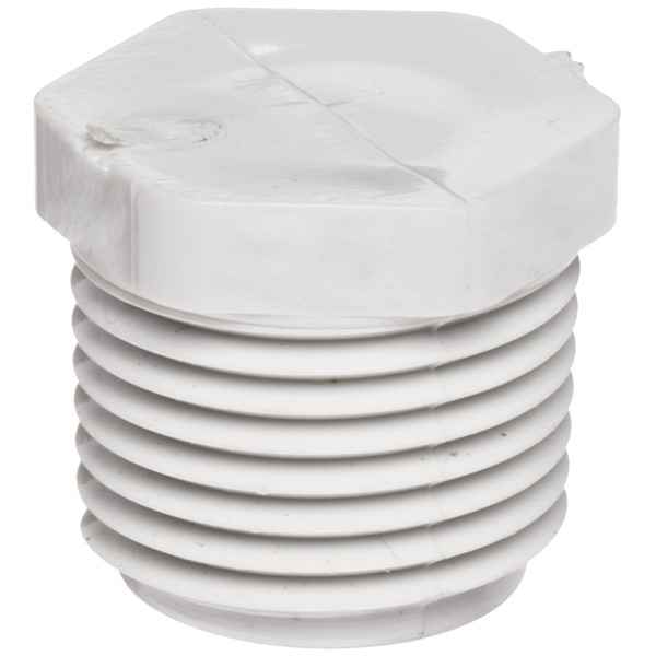 This Spears 450 series schedule 40 PVC plug fitting has male NPT threads, and is suitable for closing or terminating the end of a pipe or fitting with female NPT threads. The National Pipe Taper (NPT) threads create a tighter seal than straight threads. The fitting is made of white PVC (polyvinyl chloride) for chemical and corrosion resistance, high strength, and less weight than fittings made from metal. It is compatible with schedule 40 PVC pipes and fittings and is suitable for cold-water pressure distribution systems including irrigation, pool and spa, potable water, and chilled water applications. PVC can be connected to other materials such as steel, copper, or cast iron using transition fittings. The fitting has a maximum operating temperature of 140 degrees F, meets ASTM International D1784 and D2466 standards for quality assurance, and is certified by National Sanitation Foundation International (NSF) for potable water service. This schedule 40 PVC plug fitting is suitable for closing or terminating pipes used for conveying drinking water, waste water, chemicals, and other liquids in a range of industries.