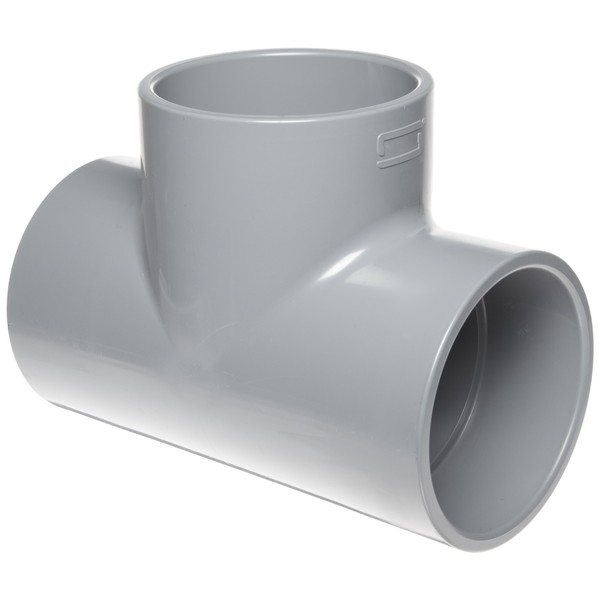 This Spears 801-C series schedule 80 PVC tee fitting has socket openings on each end, and is suitable for connecting and branching three pipes. The socket ends connect to pipes with a smooth bore for enhanced flow. The fitting is T-shaped and has three openings to connect and branch three pipes, two on the main run and one branch at a 90-degree angle from the middle of the tee. Pipe dimensions for tees are represented as A x B x C. “A” and “B” indicate the main run on the fitting, and “C” indicates the branch. The fitting is made of medium gray CPVC (chlorinated polyvinyl chloride) for chemical and corrosion resistance, high strength, and better resistance to high temperatures and pressures than PVC (polyvinyl chloride), making it suitable for both hot and cold water pressure distribution systems in residential and commercial applications. CPVC can be connected to other materials, such as steel or copper, using transition fittings. The fitting has a maximum operating temperature of 200 degrees F, meets ASTM International D1784 and F439 standards for quality assurance, is certified by National Sanitation Foundation International (NSF) for potable water service, and is American Bureau of Shipping (ABS) Type Approved for marine and offshore applications. This schedule 80 CPVC tee fitting is suitable for connecting pipes for conveying drinking water, waste water, chemicals, and other liquids in a range of industries.