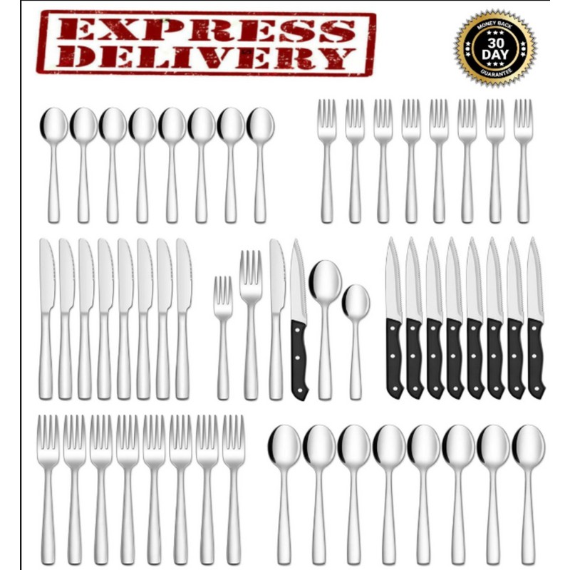 - SILVERWARE SET: 48 piece flatware set, service for 8. Including 8 dinner knives, 8 dinner forks, 8 dinner spoons, 8 teaspoons, 8 salad forks and 8 Steak Knives. Proper size weight and good quality for all family, not only meets the dining needs, but also makes the table setting elegant.