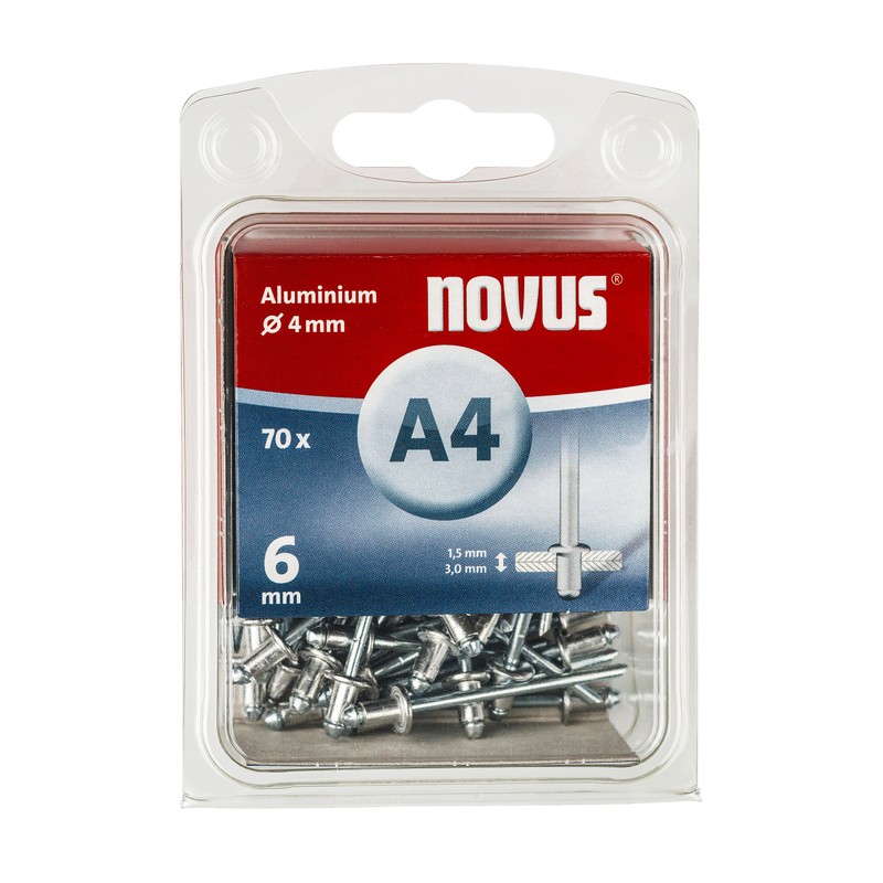 • Blister pack of 70 blind rivets with a diameter of 4 mm, a length of 6 mm and a clamping length of 1.5 - 3.0 mm