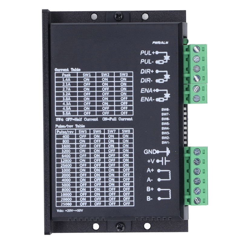 1、Better Design: Standard single pulse interface can provide semi automatic current lock function, energy saving. 2、Smart Control: 1.4A‑5.6A 8 gear optional current values, 20‑50V DC power supply voltage, and the semi enclosed case can adapt to more environments. 3、Reliable Work: High speed optocoupler isolation signal, strong anti high frequency interference ability. 4、Safer Working: Built in overheating, overcurrent, overvoltage, undervoltage protection, up to 1285 subdivisions to choose from. 5、Good Matching: Can drive 4, 6, and 8 wire 2 phase stepper motors. The control signal is 5‑24V universal, and no series resistance is required.