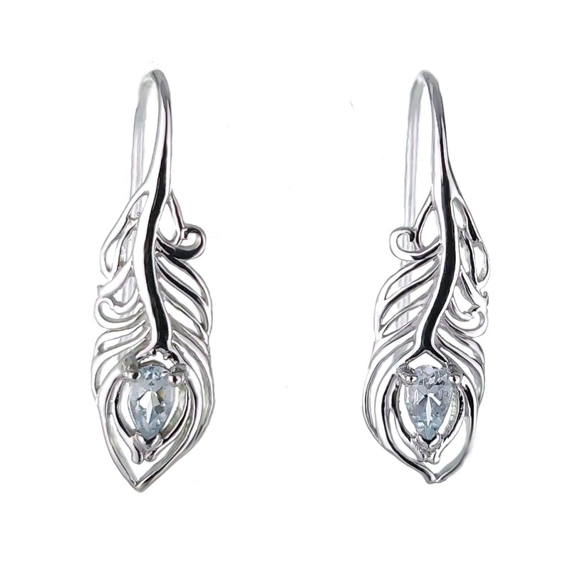 - Sterling Silver Aquamarine Peacock Feather design dangle Earrings with an eye set with a natural Mozambique pear Aquamarine
