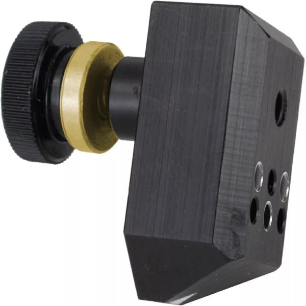 This anodized aluminum jig accurately locates mounting pin holes in the back of a guitar headstock. Use it before drilling for the alignment pins found on many modern enclosed tuning machines. These tuners don't use the traditional exposed tuner mounting screw, but rather a hidden pin on the underside of the tuner housing.