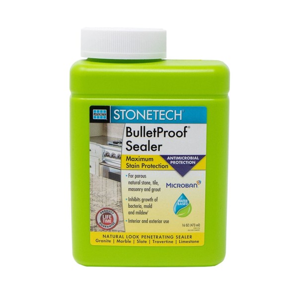 STONETECH BulletProof Sealer is a water-based penetrating sealer that provides maximum stain protection while preserving the natural look of the surface. It can be used as a grout sealer, tile sealer, masonry sealer and in many other applications. This premium sealer offers the best protection on the most porous natural stone, tile, masonry and grout surfaces in interior and exterior applications. A safer professional grade alternative to high VOC solvent-based sealers that is better for you and the environment and comes with a lifetime product satisfaction guarantee. This water based sealant is great for use as a countertop sealer, backsplash sealer and on kitchen countertops, bathroom vanities, walls and floors.