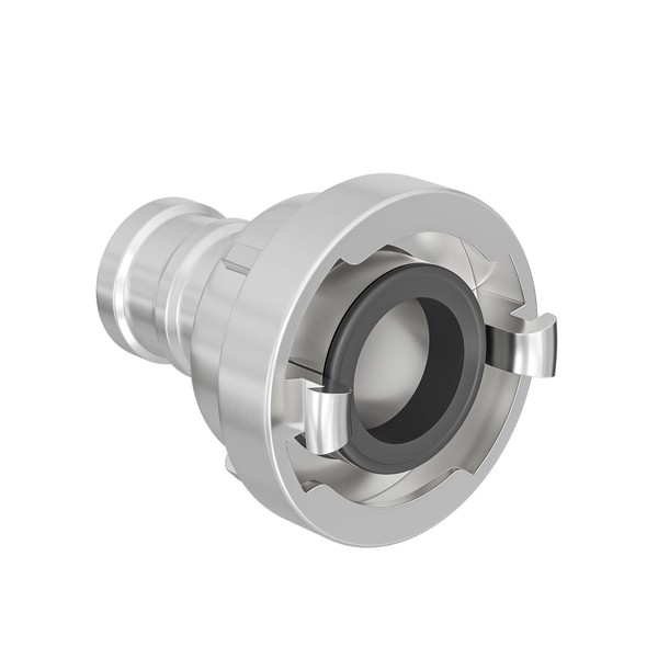 The pressure coupling with long connecting piece is employed for connecting hoses with a large diameter. This storz coupling allows a fast connection or diconnection by means of a 120° rotation. Due to the rotatable connecting piece, it is not possible to twist the hose while coupling. The coupling is used in the industries, fire brigades, refineries, agriculture, construction industry, navigation, military and civil protection.