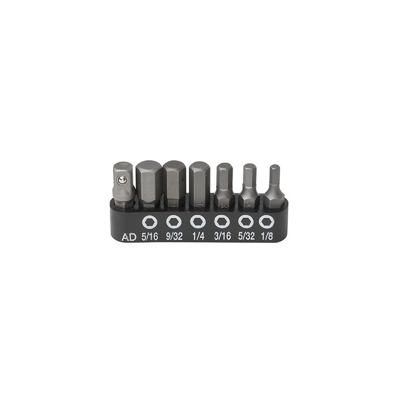 [Set Contents] Hex bits: 1/8, 5/32, 3/16, 1/4, 9/32, 5/16 (inch) 1/4 inch (6.3 mm) socket adapter.