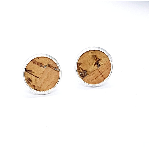 Stud Earrings Silver Round 8 mm Natural Cork with Silver Inclusions - Vegan Handmade Made