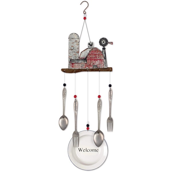 - Barn Farm Wind Noisemaker Chime features a barn, silo, and windmill on the top with dangling forks, spoons, and plate reading "Welcome"