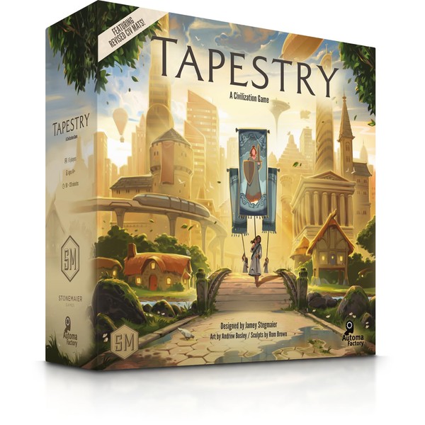 Tapestry is a 2-hour epic civilization game for 1-5 players. Create the civilization with the most storied history, starting at the beginning of humankind and reaching into the future. The paths you choose will vary greatly from real-world events or people—your civilization is unique! In tapestry, you start from nothing and advance on any of the 4 advancement tracks (science, technology, exploration, and military) to earn progressively better benefits. You can focus on a specific track or take a more balanced approach. You will also improve your income, build your capital city, leverage your asymmetric abilities, earn victory points, and gain tapestry cards that will tell the story of your civilization. 1-5 players 90-120 minute play time contents: 16 unique factions 18 painted landmark miniatures 150 building and outpost miniatures 43 tapestry cards 33 tech cards full solo mode with automa cards 3 custom dice 2-piece custom insert and much, much more