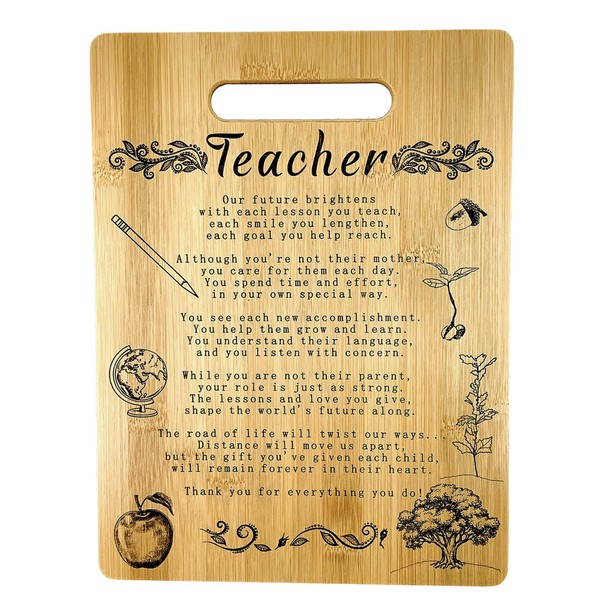 - Show your teacher appreciation by giving him/her a beautifully engraved all natural, organic bamboo cutting board. These are low volume high quality gifts. I personally make and inspect each and every one.