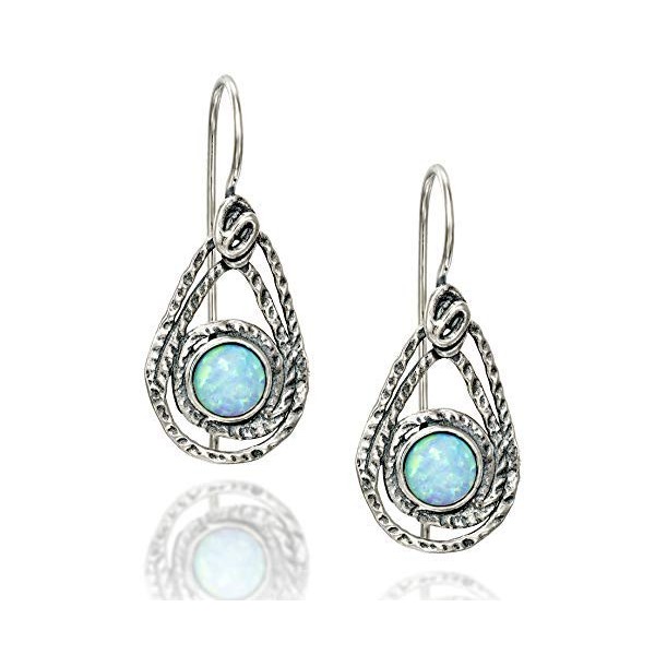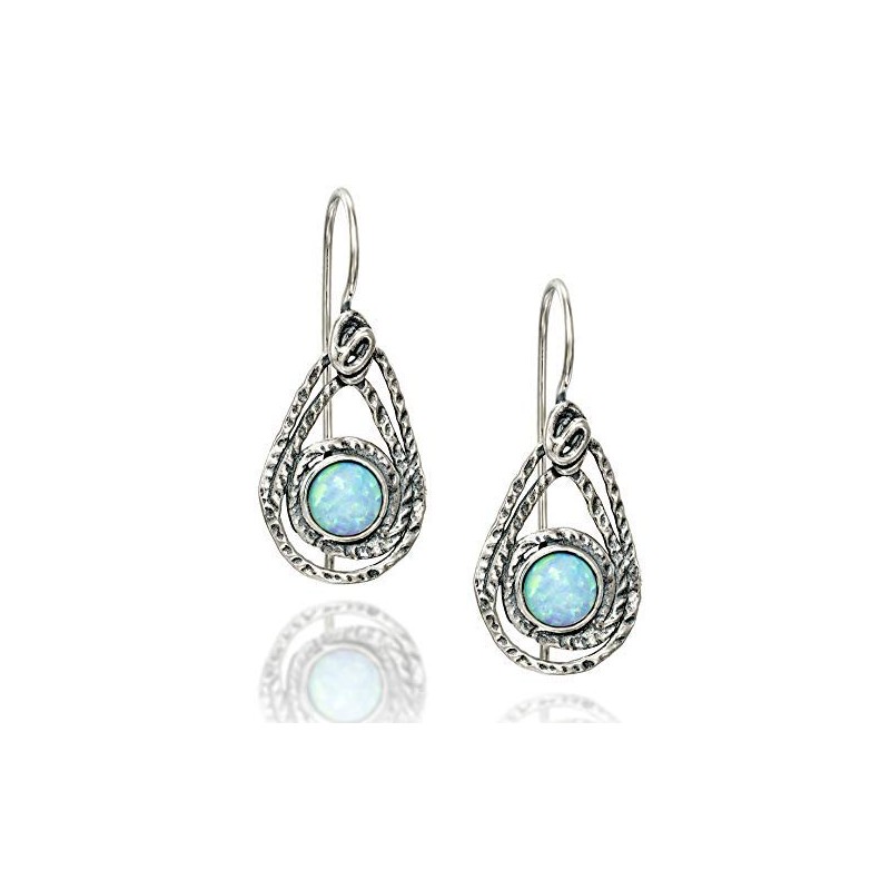 Vintage look teardrop shaped created white Opal earrings. White Opal 925 Sterling Silver drop earrings. A 6 mm round cabochon created Opal is inlaid in each of these textured free form teardrop shaped Silver earrings. Unique Artisan Design.