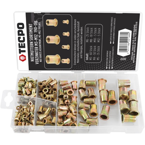 TECPO Rivet Nuts Box Assortment Galvanised M3-M12 Rivet Nut Blind Rivet Nuts for Riveter 190 Pieces