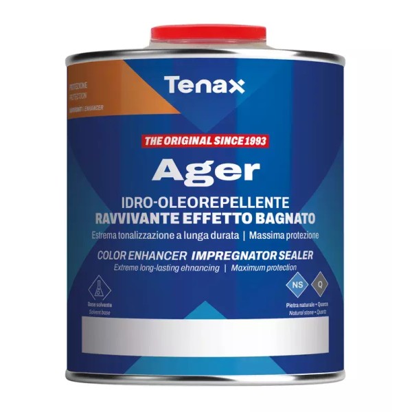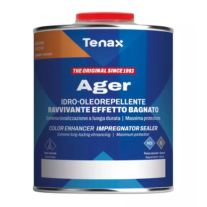 Tenax Ager is a premium stone color enhancer and sealer designed to revitalize, protect, and enhance the natural beauty of natural stone surfaces. This oil-based, UV-resistant formula penetrates deep into the stone, enriching its grain and color while offering long-lasting protection. Ideal for both interior and exterior applications, Ager is perfect for matching stone edges to polished surfaces, concealing micro fissures, and intensifying stone color with a stunning wet-look finish.