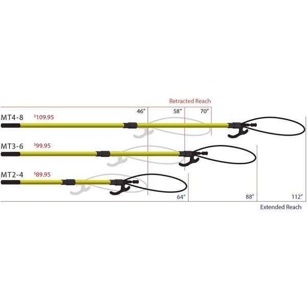 * **Compact** (MT2-4) extends from 2 to 4 feet * **Medium** (MT3-6) extends from 3 to 4 feet * **Long** (MT4-8) extends from 4 to 8 feet