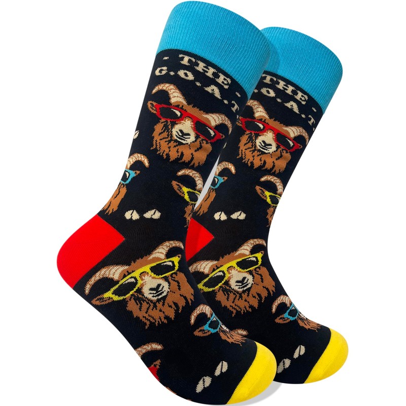 - ✅ The G.O.A.T DESIGN - Our goat socks for men showcase a vibrant, eye-catching pattern with bold colors. The phrase "G.O.A.T." (Greatest Of All Time) is prominently displayed, making these socks stand out with their fun and unmistakable goat motif.