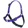 The original SENSE-ation Harness is a no-pull dog harness that works wonders for positive reinforcement dog training, or just taking gentler walks with your pooch. The SENSE-ation Harness comes in seven sizes and two colors - dark purple (with a black belly strap) or all black. An instruction booklet comes with all SENSE-ation Harnesses. The SENSE-ation is similar to the SENSE-ible Harness in design, however the SENSE-ation uses a custom Softouch polyester webbing for added comfort. The SENSE-ation Harness also features Duraflex plastic hardware, instead of metal. The O-rings on the chest and sides are nickel plated steel for extra durability. The curved side-release buckle and strap keepers are a plus. The girth strap, also called a "belly strap" comes in a coordinating color, making it easy to identify, and therefore easier to put on. The SENSE-ation Harness stops your dog from pulling, without choking, stress or otherwise harming your pet. You can use it right away - there is no acclimation period. Best of all, the SENSE-ation Harness is a favorite of positive reinforcement dog trainers and humane societies worldwide. Awarded "Gear of the Year" by The Whole Dog Journal, 2003. Using a flexible measuring tape, measure from just behind the front legs all the way around your dog. You are measuring the circumference of the body just behind the front legs, like performing a chest or belt measurement on a human. X-Large 1 Inch Width 39 - 50 Inch girth*. Large - 1 Inch Width 32 - 40 Inch girth*. Large -3/4 Inch Width 31 - 40 Inch girth*. Medium/Large - 1 Inch Width 27 -32.5 Inch girth*. Med /Large - 3/4 Inch Width 26 - 32 Inch girth*. Medium - 1/2 Inch Width 24 - 28 Inch girth*. Small - 5/8 Inch Width 20 - 24.5 Inch girth*. X-Small - 7/16 Inch Width 16.5 - 20.5 Inch girth*. Mini - 7/16 Inch Width 13 - 16.5 Inch girth*. * If the measurement falls within two harnesses, we suggest the larger size. Example: 20" girth = Small.