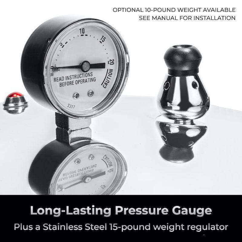 Use the easy-to-use pressure gauge or choose to watch the pressure level with your 15-pound or 10-pound weight regulator required for your unique recipe.