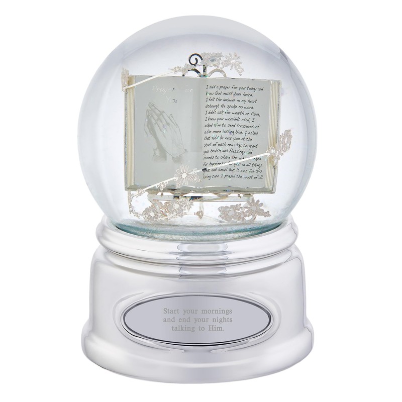 • SUPERIOR QUALITY AND DESIGN – This personalized musical snow globe features an open book with hands in prayer on one page and, on the facing page, a moving poem. Mounted on a gleaming silvered base, this enchanting piece stands 7 inches tall.