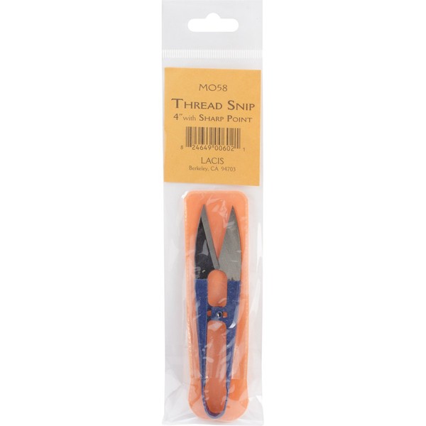 - A 4 inch pointed snip with blue enameled handle, ground blades, and a retainer pin to control opening