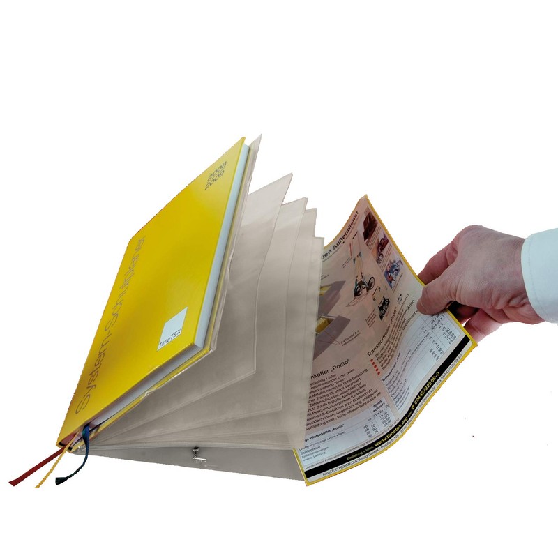 - On the inside of the planner, a stapling tongue allows you to file punched DIN-A sheets. In addition, loose documents can be inserted into the triangular slip pocket on the inside.