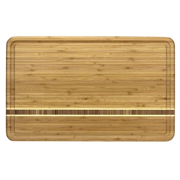 The Totally Bamboo Dominica bamboo serving and cutting board is a beautiful option to both cut and serve. The Dominica is part of Totally Bamboo Caribbean Collection, one of the first lines of bamboo cutting boards on the market! The entire collection features a gorgeous inlay of dark end-grain bamboo flanked by strips of natural bamboo. This inlay strip blends wonderfully with the vertical-grain bamboo construction of the board. The Dominica carving board features deep juice Wells along the edge of the board to collect any run-off from juicy meats or fruits — keeping countertops clean! When the meal is done, the board cleans easily with hand washing; Do not soak or wash in the dishwasher. The board measures 20-5/8 inches by 12-1/2 inches and is 3/4 of an inch thick. Add a bit of island-inspired design to your home with the Totally Bamboo Caribbean Collection.