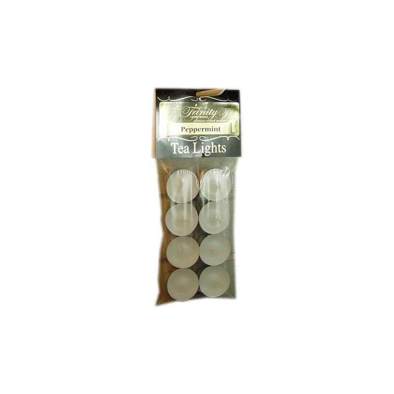 Trinity Candle Factory Premium Scented Peppermint - Tea Light Candle - 8 Pack. This 8 pack of tea light candles is premium scented for maximum fragrance throw. Burn time 4-8 hours, fits all standard tea light holders. This Peppermint fragrance You will smell the distinct aroma of a Peppermint. This aromatherapy Peppermint candle will help with sinus problems when infused in the air. 100% Satisfaction Guarantee.