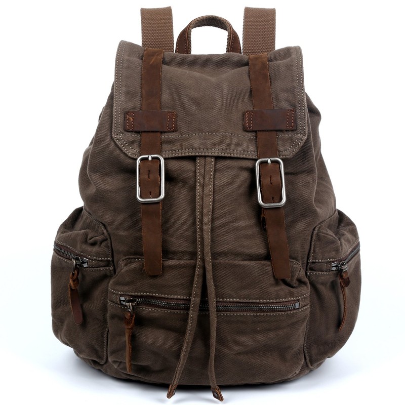 100% cotton canvas and 100% genuine top skin leather. This drawstring canvas backpack is available in camel or army green and features silver tone hardware and brown distressed leather trim. Adjustable straps as well as three zipper pockets adorn the front of the bag. Internal features include a padded slide space with velcro strap, zipper pocket, and two slip pockets. 12”W X 15”H X 5.5”D; 3” Drop TSD160510