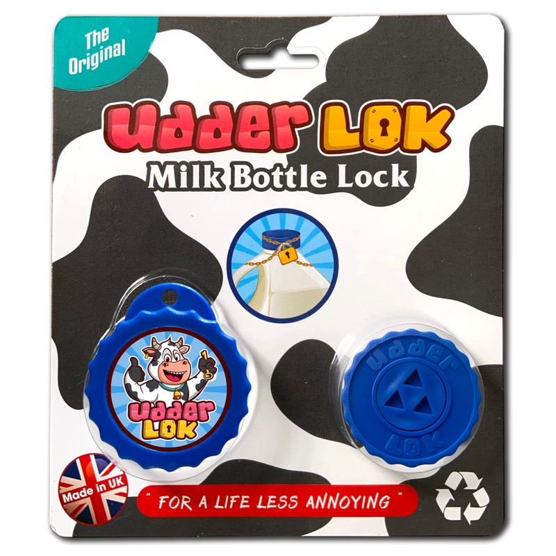 UdderLok - The Original Milk Bottle Lock to stop people pinching your milk! Locking Lily says 'Are you suffering a cost of living crisis or rather a cost of thieving crisis? Buy an UdderLok!' Blue UdderLok's are compatible with most supermarket plastic milk containers such as those from Tesco, Morrisons, Aldi, Lidl, Asda, M&S, Co-Op and Sainsburys - it doesn't fit the plastic milk containers with the annoying little tear-off anti-tamper tabs (see images) UdderLok and its packaging are fully recyclable Designed and manufactured in West Yorkshire Also available as a tea-round pack so you can share the joy with your friends at work watching that sneaky milk thief trying to nicking your milk at break time!