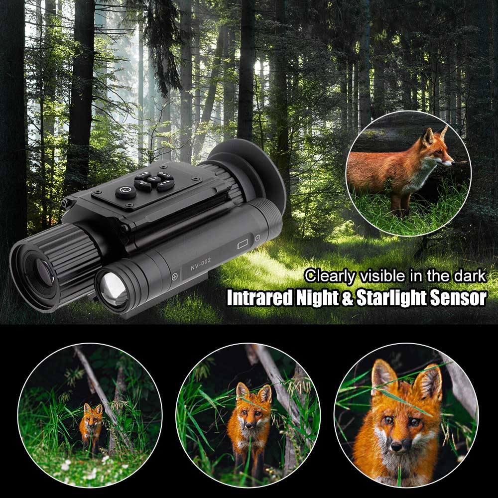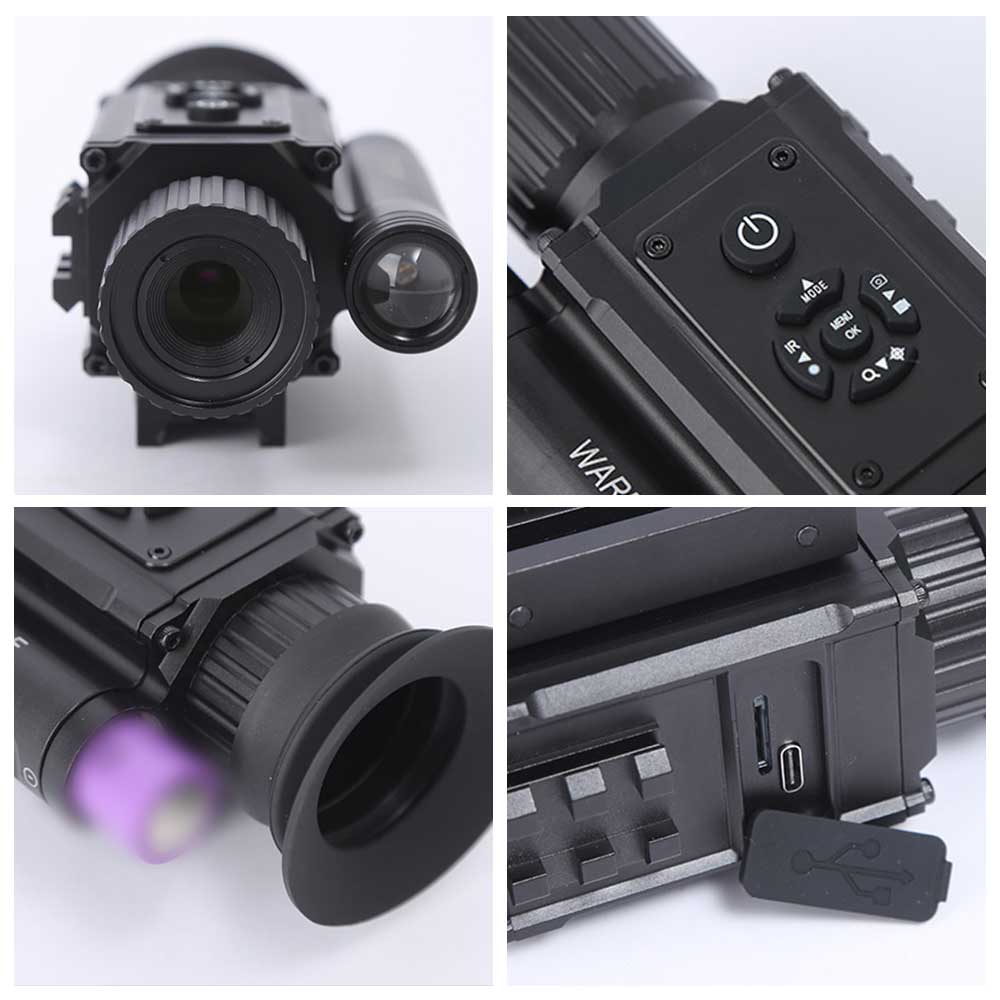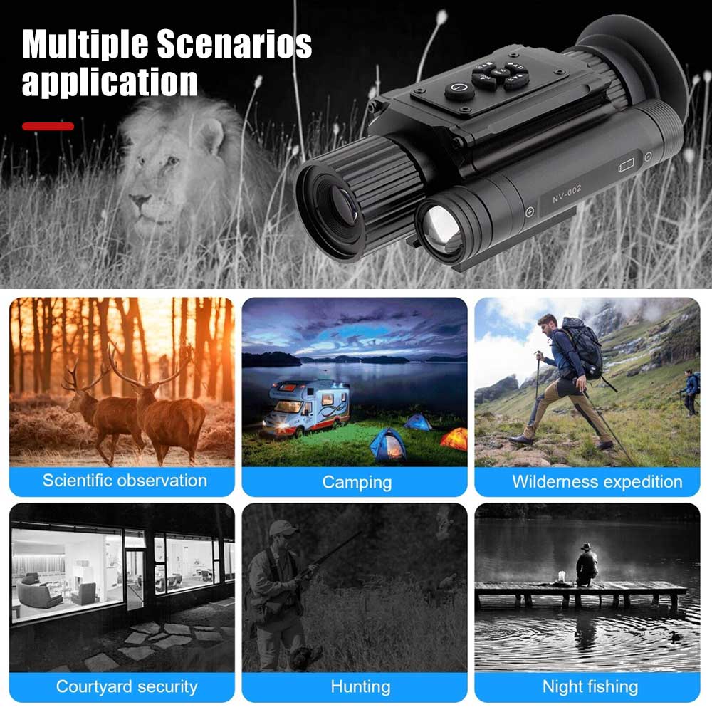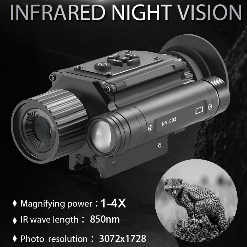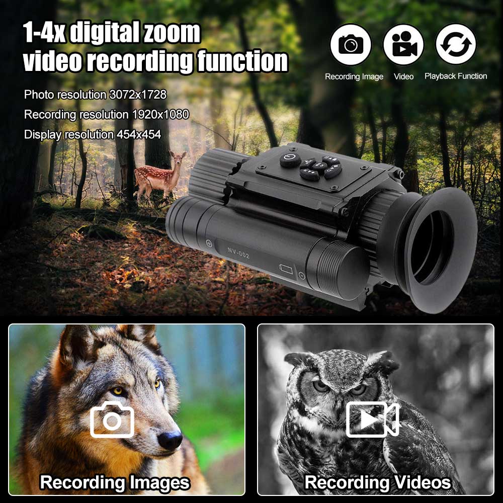 - Magnifying Power1-4XModel No.NV-002IR Wave Length850nmIR Power3WStorage TypeTF Card (Not included)Transmission MethodTF Card Type-C Data CableFocusing3CM-~~IR Illuminate Distance200MPhoto Resolution3072x1728Video Resolution1920x1080Display Resolution454x454Output TypegMP4Frame Rate