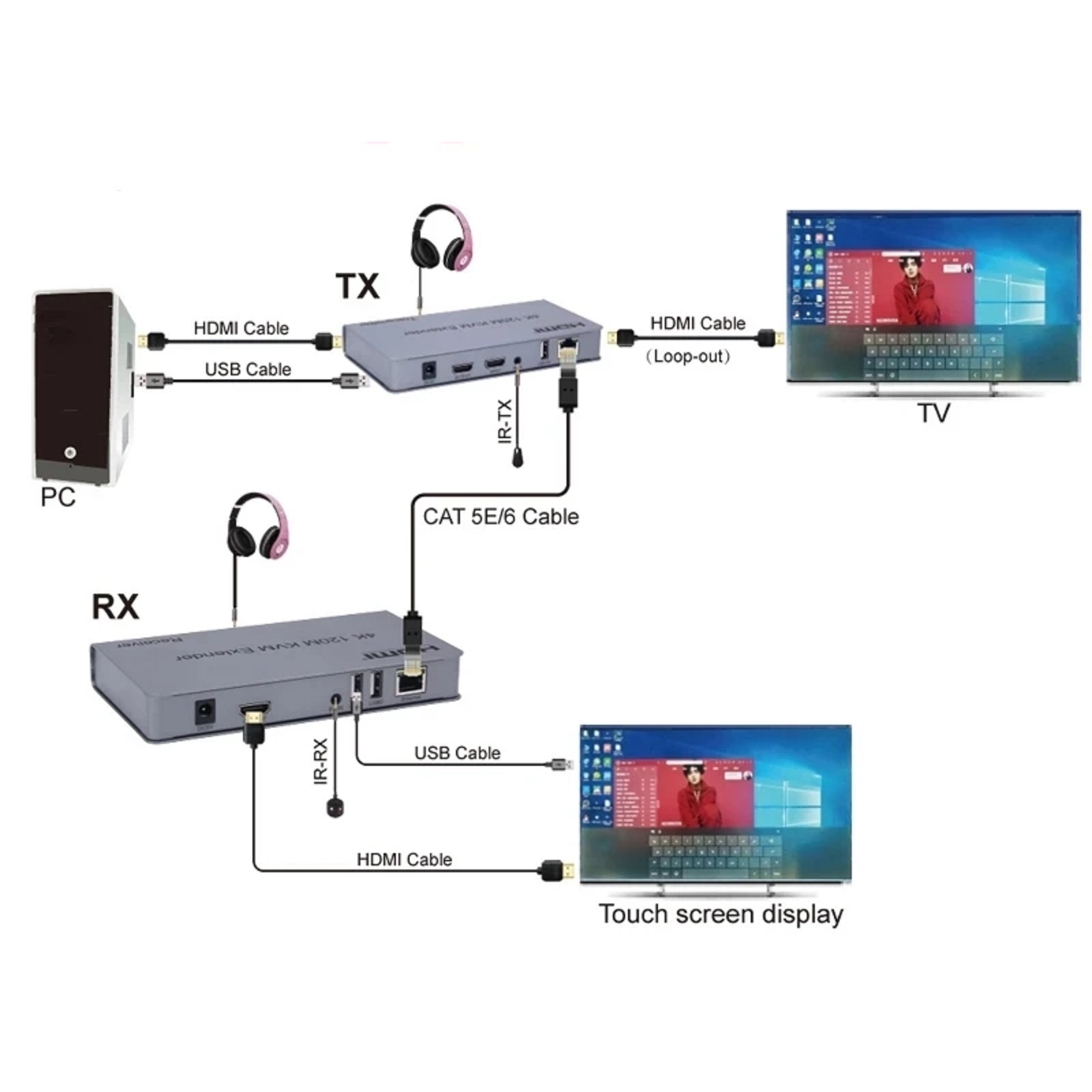 Length of CAT5e/CAT6 cable between Rx and TX: 120 meters