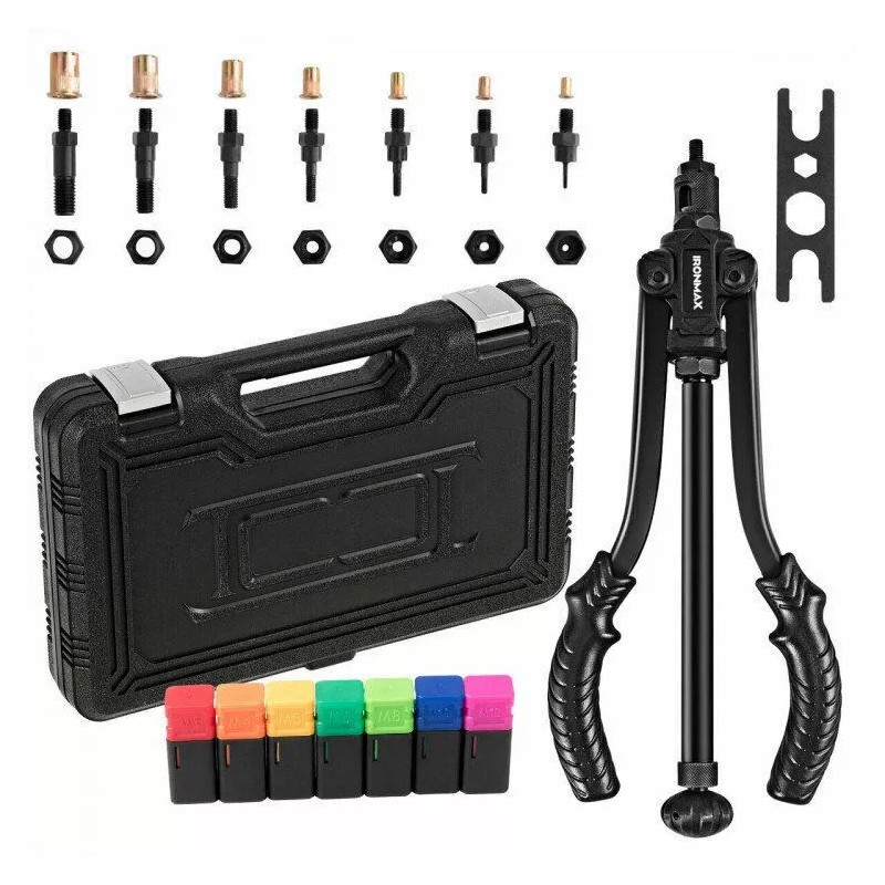Benefiting from interchangeable mandrels and 70 pcs rivet nuts, the riveter provides customizable solutions to wide range of riveting applications. Designed with quick-change mechanism, the rivet nut tool provides easier and more efficient change of mandrels and nosepieces. Adopting heavy-duty carbon steel and aluminum alloy, the rivet nut tool ensures solid construction. In addition, rustproof surface can prevent the rivet nut tool from corrosion to offer prolonged service time. What’s more, ergonomic long arm will help generate more torque when you are pressing handle. More advantages of the rivet nut tool are there for you to tap into.