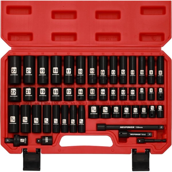 This MIXPOWER 3/8" Drive Deep Impact Socket Set. This socket is high-contrast laser etched with high-visibility markings and hard stamped with size labels, ensure permanent socket identification. Heavy duty plastic blow-molded carrying case for easy transport, simple storage, and quick organization.