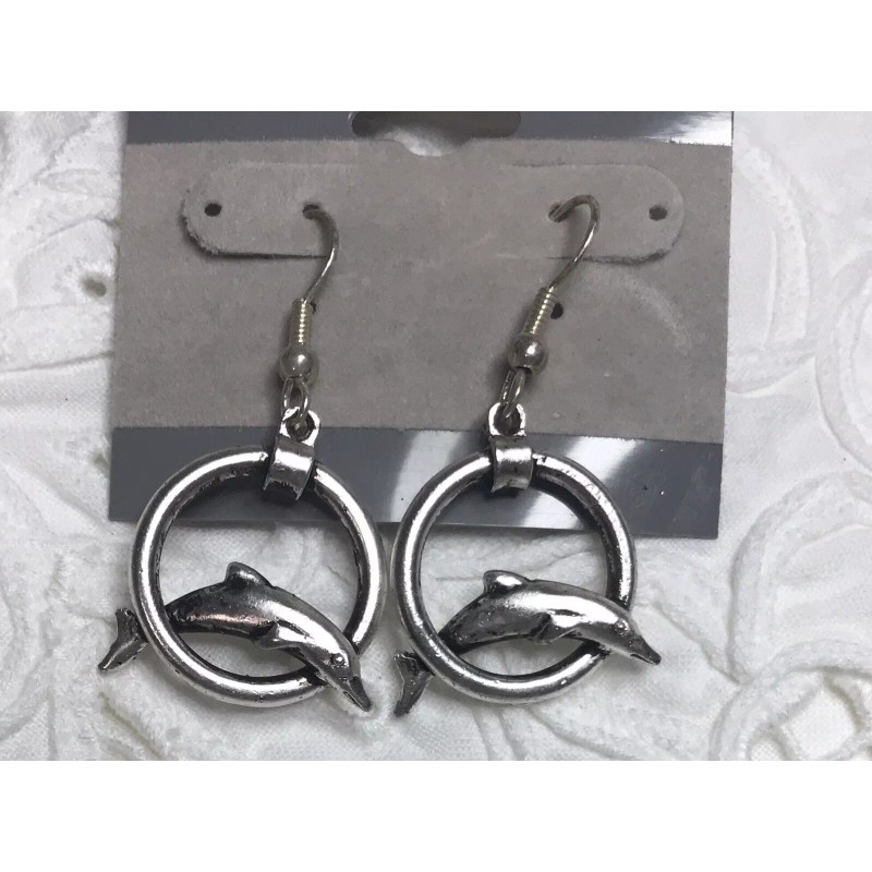 Dolphins Jumping Through Hoops Silvertone Earrings. Condition is New with tags. Dangle 1 1/2 inches long. Shipped with USPS First Class.